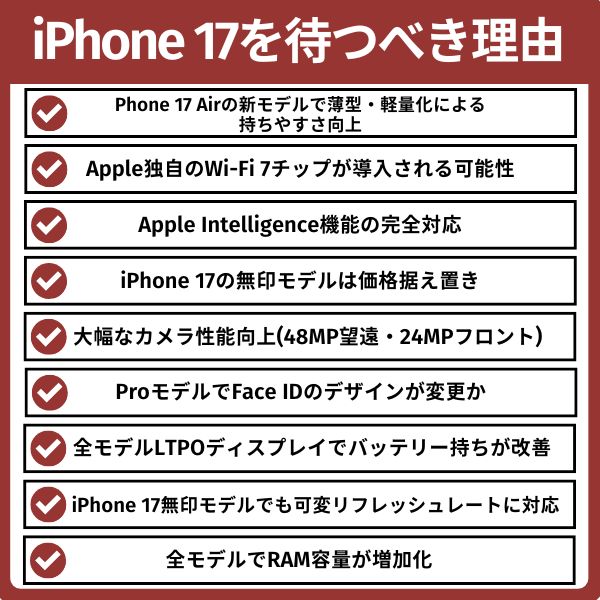iPhone 17を待つべき理由は以下の8つです。