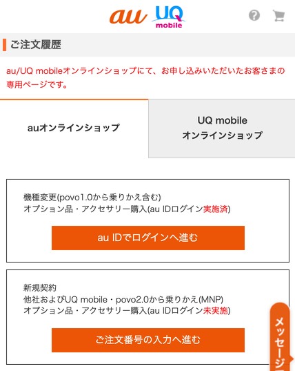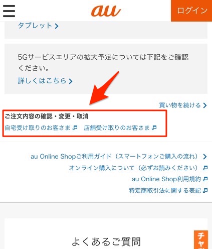 「機種変更」の場合はau IDでログイン、「新規・他社からの乗り換え」なら注文番号を入力することで、注文状況を確認できます。