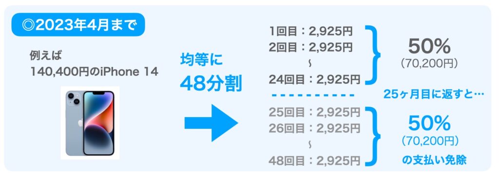 かつては、端末代金を均等に48回に分割した金額のうち、最大で24回分の支払いが免除されていました。