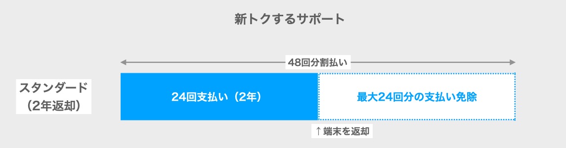 新トクするサポートは、48回払いのスマホを2年後(24回支払い後)または1年後(12回支払い後)に返却すると、残りの支払いが免除されるプログラムです。