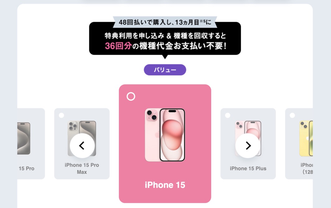 48回分割で購入することは同じですが、バリューとプレミアムは12回支払い時に端末を返却することで、最大36回分の支払いが免除されます。