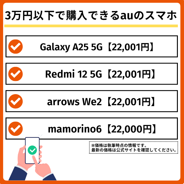auで3万円以下で購入できる安いスマホ機種について解説します。