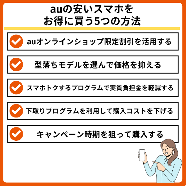 auの安いスマホ機種をさらにお得に購入する方法について解説します。