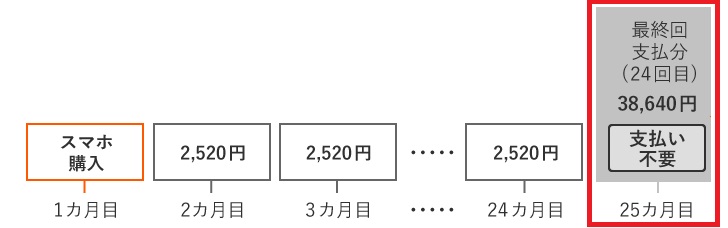 分割払いの24回目に機種代金の約40~50%にあたる金額が設定されていて、スマホを返却するとその支払いが免除になる仕組みです。