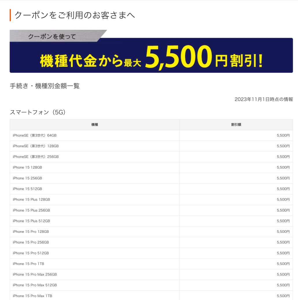 iPhone 15などの最新のモデルでも5,500円の割引を受けられるとのことです。