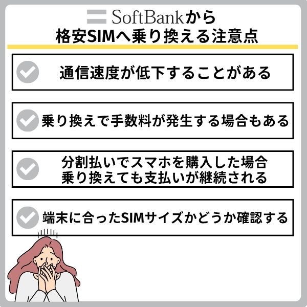 ソフトバンクから格安SIMへ乗り換える際の注意点は以下の4つです。