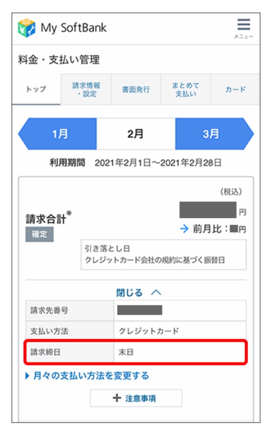 MEMO:締日はMy SoftBankの「料金・支払管理」>「トップ」タブ>「引き落とし日」>「支払い方法を確認する」で確認できます。