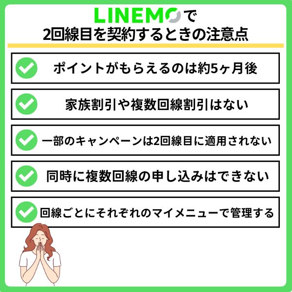 LINEMOの2回線目契約で、注意するポイントは以下のとおりです。