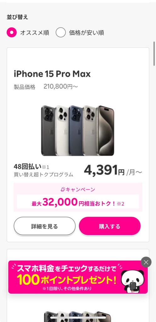 | 対象端末購入 | iPhone:最大32,000ポイント Android:最大6,000ポイント | |