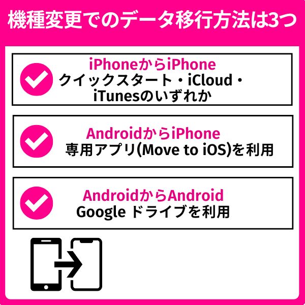 iPhoneからAndroidやAndroidからiPhoneなどのOSが違う機種変更をする際は、移行できないデータを事前にチェックしておきましょう。