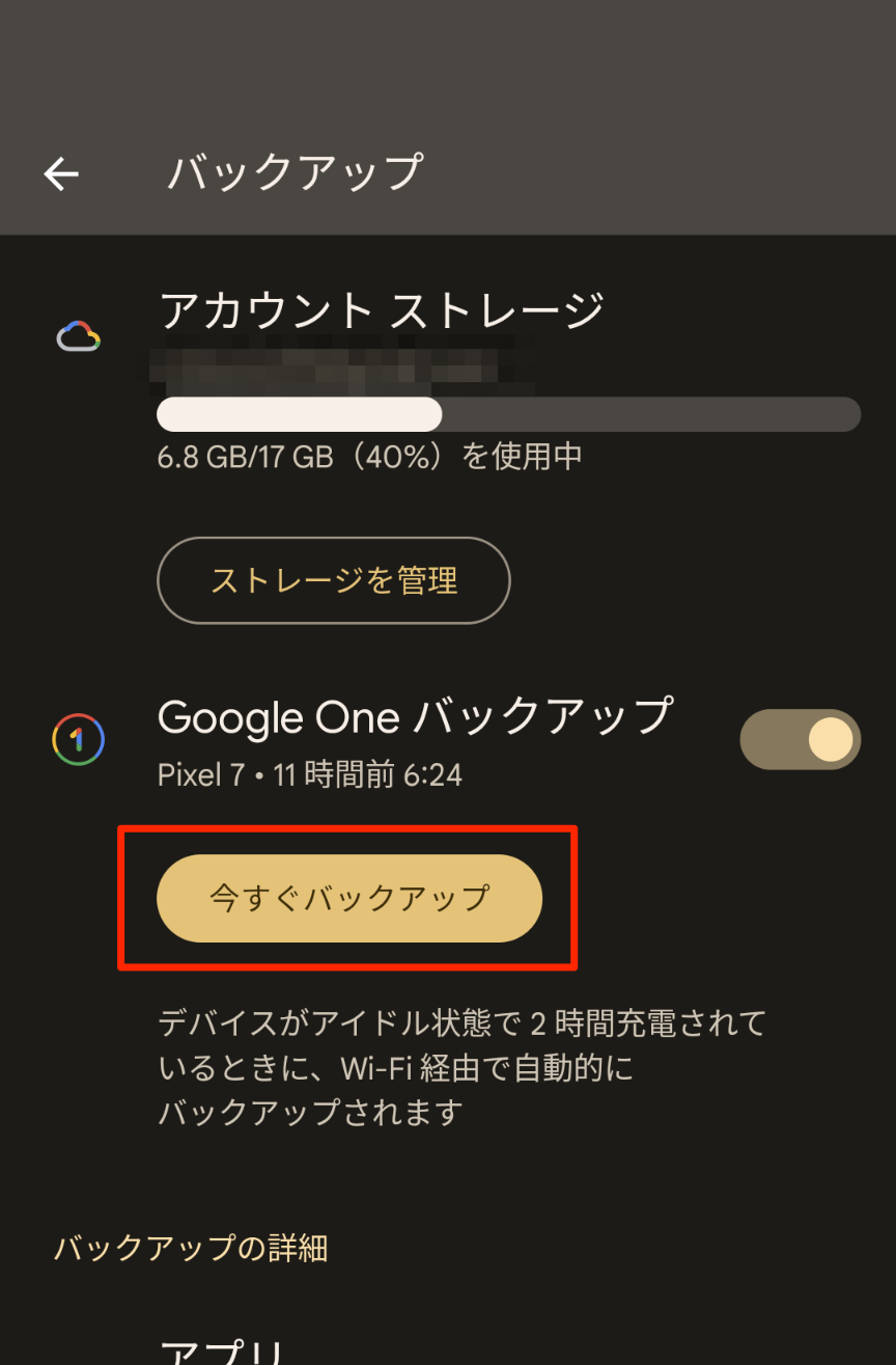 Androidスマホは「設定」アプリ>「Google」>「バックアップ」で、「今すぐバックアップ」を行ってください。