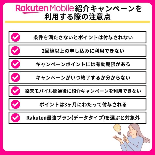 楽天モバイル紹介キャンペーンを利用する際に注意すべきポイントは以下の7つです。