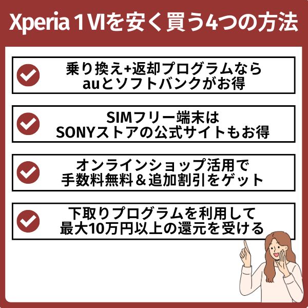 Xperia 1 VIを安く買うには、キャリアの各種キャンペーンを活用し、実質負担額を抑える方法がおすすめです。
