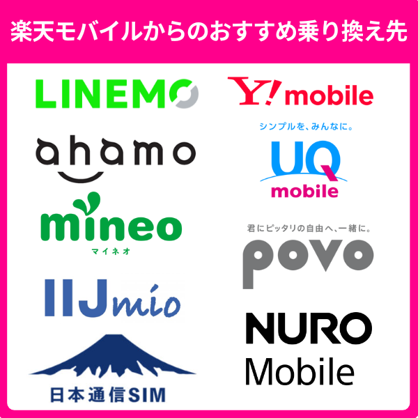楽天モバイルからの乗り換え先でおすすめなキャリアや格安SIMは以下の9つです。