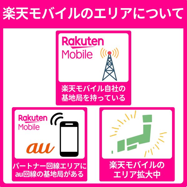 楽天回線のエリアには自社の基地局があり、パートナー回線エリアにはau回線の基地局があります。