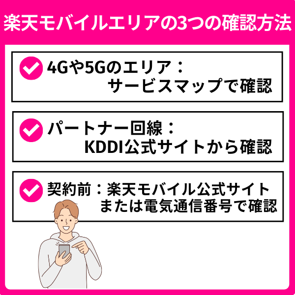 パートナー回線のエリアについては、楽天モバイルの公式サイトや、パートナー回線を提供しているKDDIの公式サイトから確認することが可能です。