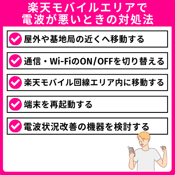 楽天モバイルのエリア内で電波が悪い時の対処法を解説していきます。