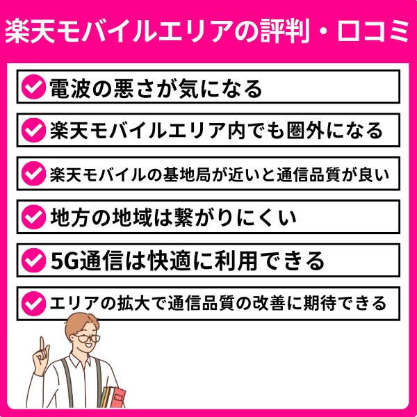 ここからは、楽天モバイルのエリアに関する評判や口コミを紹介していきます。内容は以下の通りです。