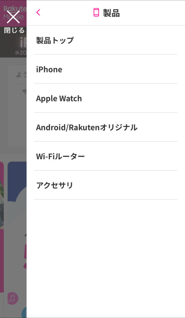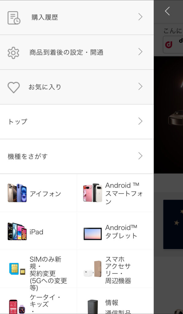 - メニューから「購入機種をさがす」をタップ