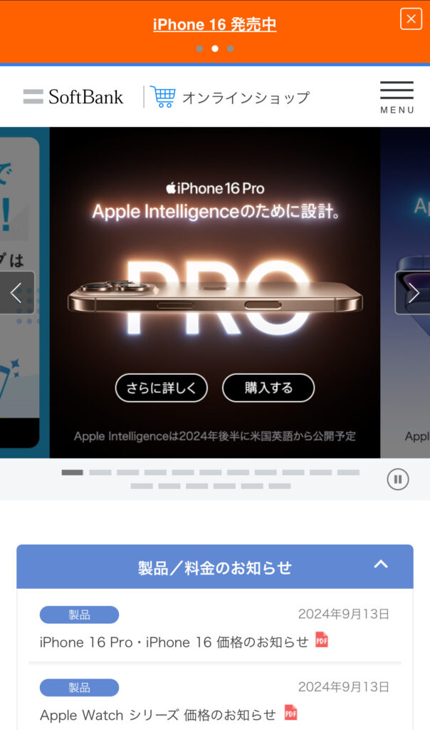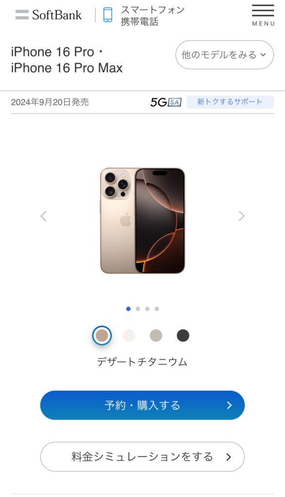 ソフトバンクオンラインショップで予約できるのは「予約商品」と表示されているiPhone16のみです。