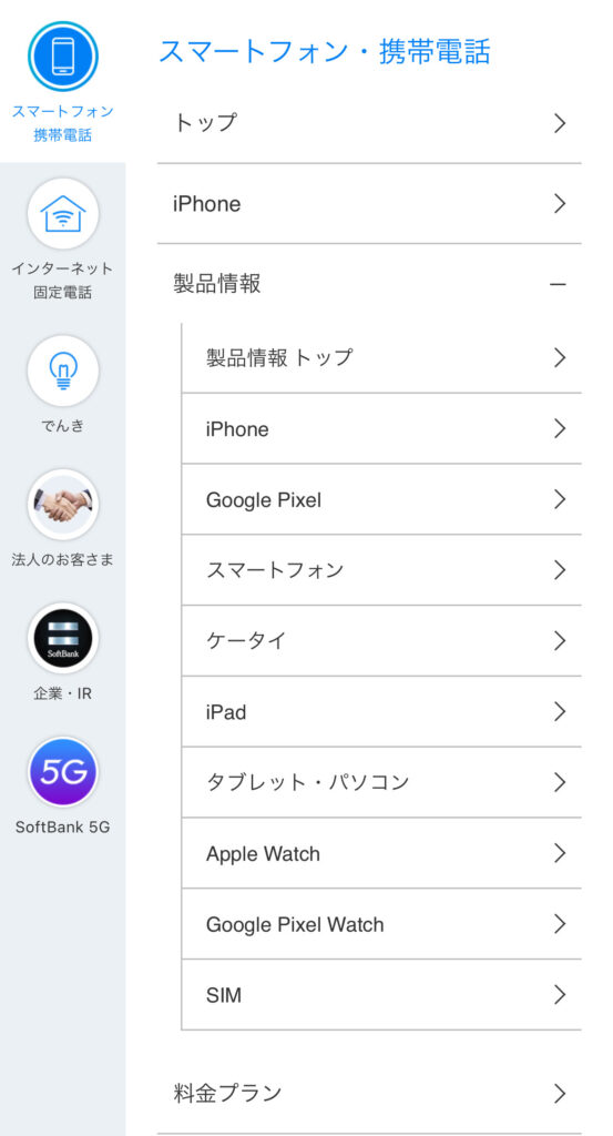 - メニューから「プラン・製品」をタップ