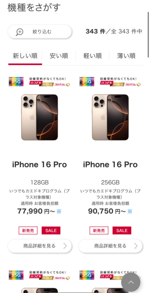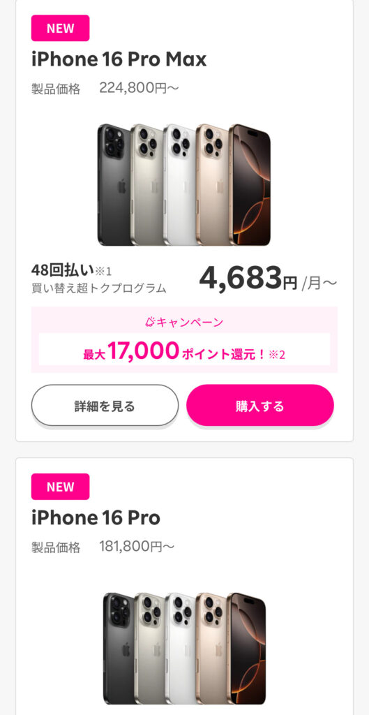 例えばiPhone16 Proなら、48回払いで3,787円(税込)/月〜、支払い総額は90,888円(税込)~です。
