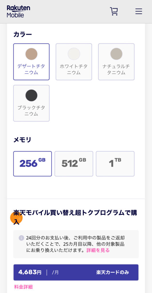 楽天モバイル買い替え超トクプログラムを利用し、48回払い+25ヶ月目に対象機種を返却すると機種代金が安くなります。