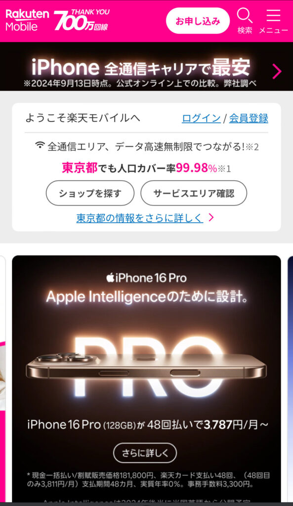 楽天モバイルでiPhone16の在庫・入荷状況を確認する方法・手順は次のとおりです。