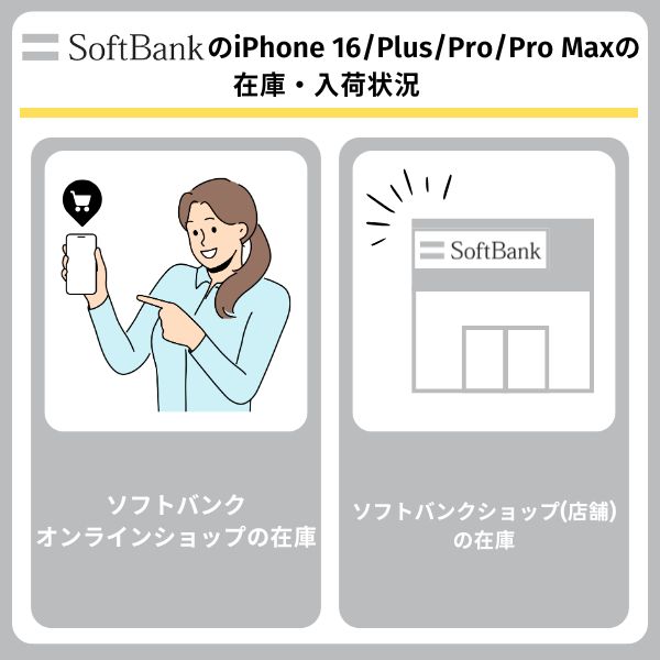 ソフトバンクのiPhone16/Plus/Pro/Pro Maxの在庫状況は、2つのどちらかで確認できます。