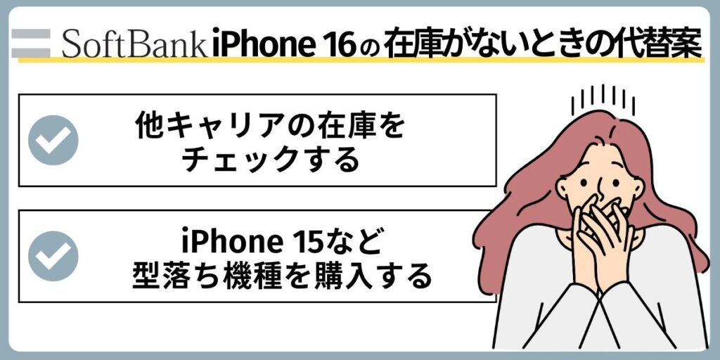ソフトバンクでiPhone16の取り寄せに時間がかかる場合の代替案を、下記2つにまとめました。