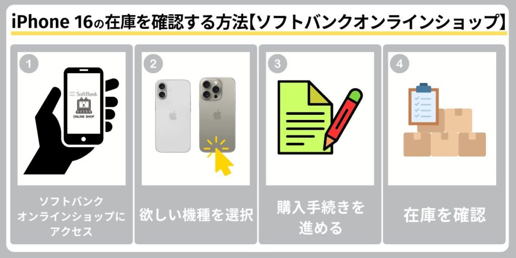 ソフトバンクでiPhone16/Plus/Pro/Pro Maxの在庫状況を確認する方法は以下のとおりです。