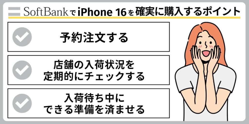 iPhone16の入荷後、ソフトバンクで確実に購入するためには、3つのポイントが重要です。