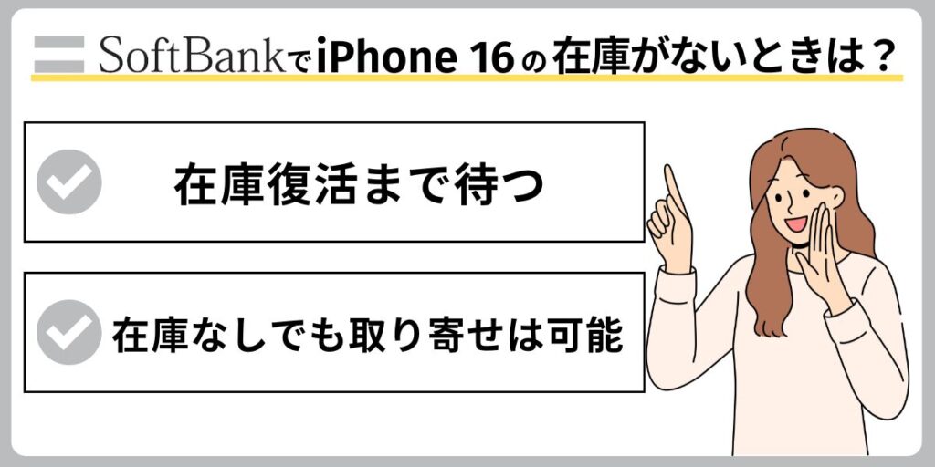 ソフトバンクでiPhone16の在庫がない場合はどうしたら良いか、具体的な方法を下記2つにまとめました。