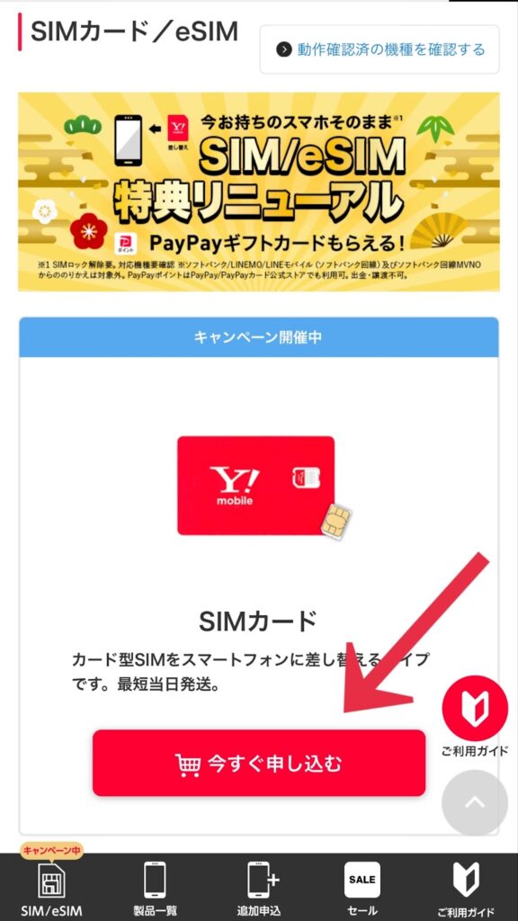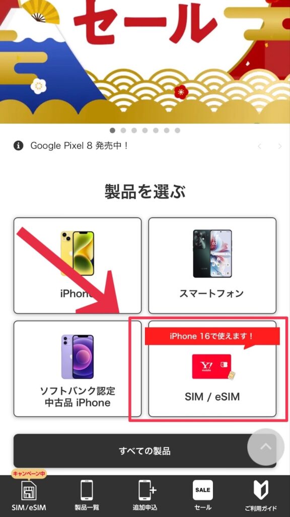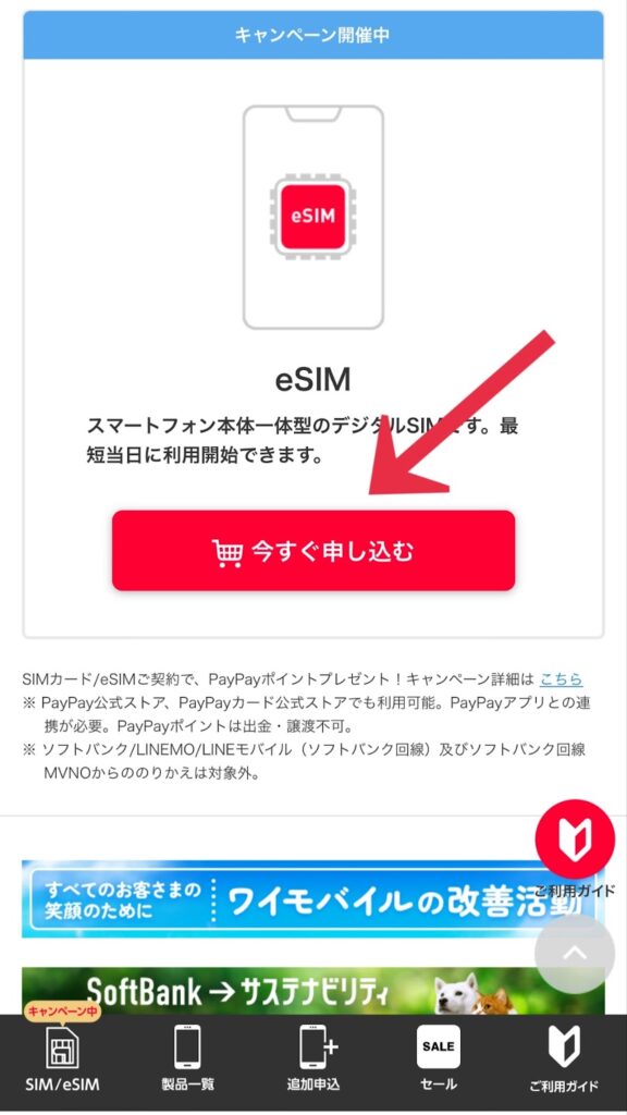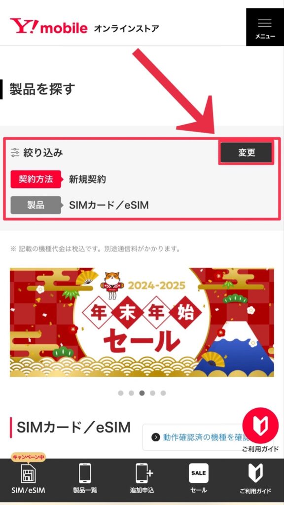 - ワイモバイルオンラインストアにアクセスして「SIM / eSIM」をクリックする