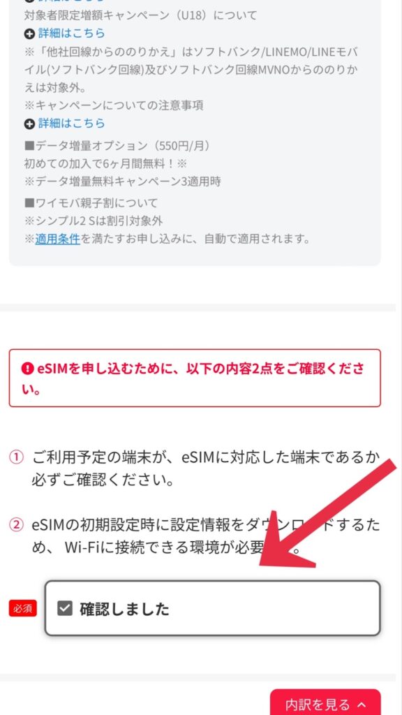 - eSIMについて2つの内容に問題なければ「確認しました」にチェックを入れる