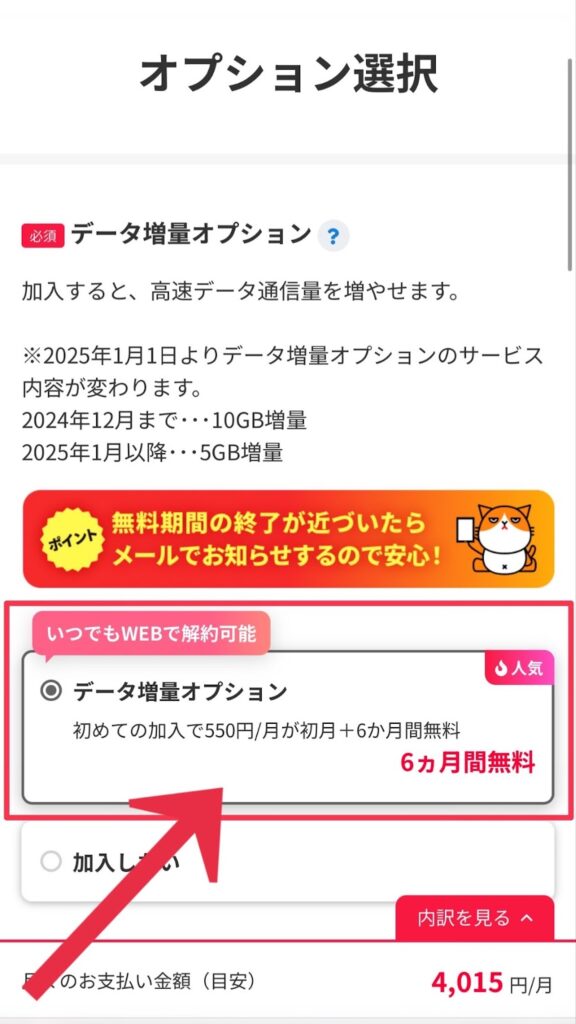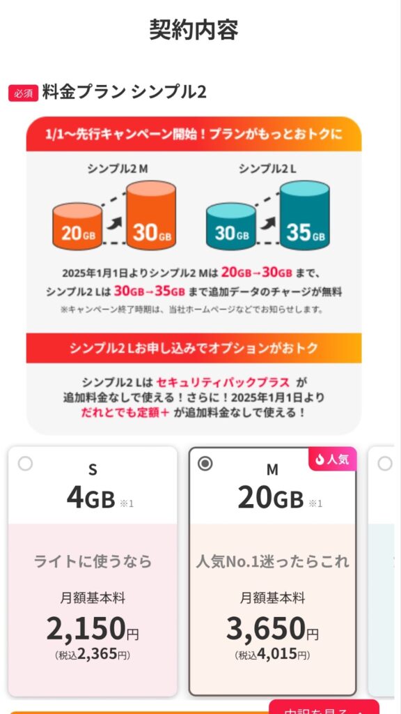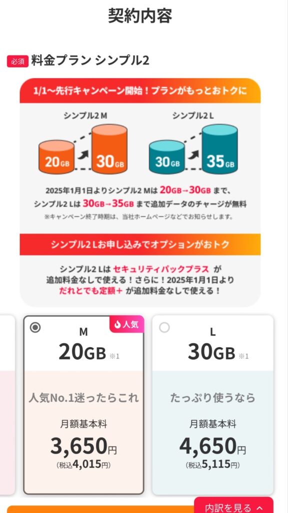 シンプル M、シンプル Lのどちらかを選択した場合、データ増量オプションの有無を選択します。