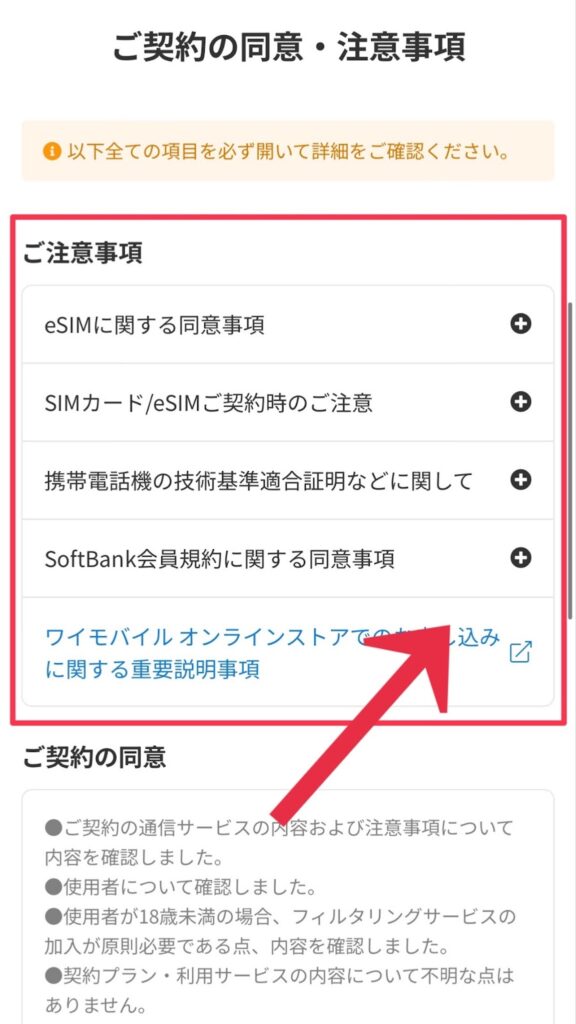 eSIMだった場合は2つの内容を確認し、問題なければ「確認しました」にチェックを入れていきます。