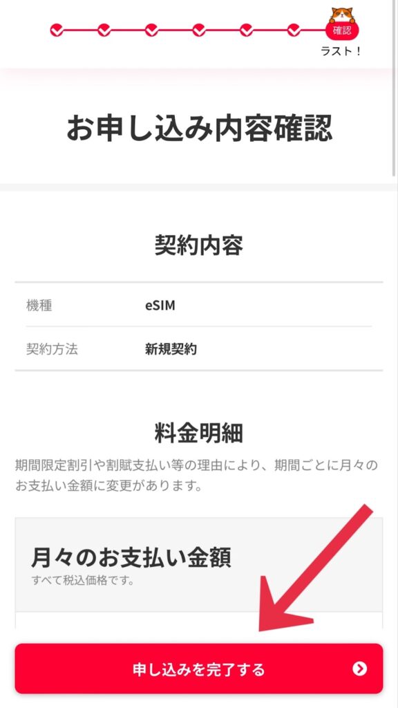 今まで入力した契約内容や個人情報に相違がないかを確かめて、問題なければ「申し込みを完了する」をクリックして完了です。