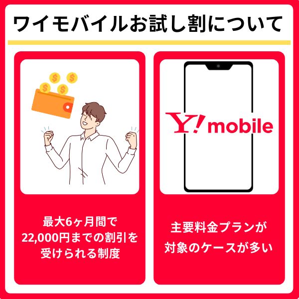 ワイモバイルのお試し割は、最大6ヶ月間で合計2.2万円までの割引を受けられる制度です。