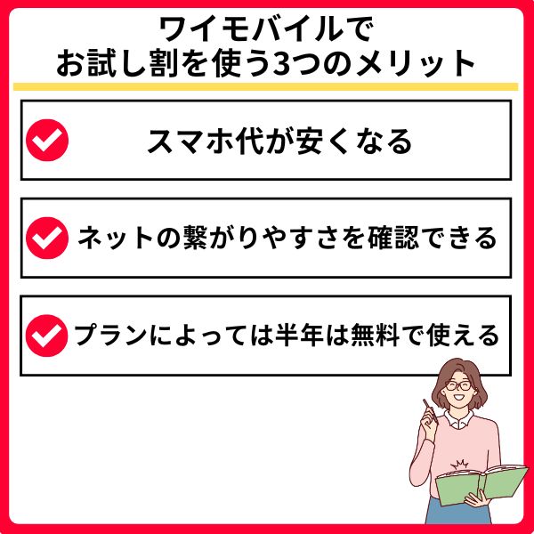 ワイモバイルでお試し割を使うと、下記のようなメリットがあります。