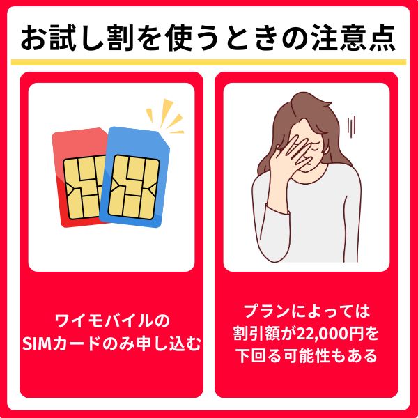 ワイモバイルでお試し割を使うとき、以下2つの注意点があります。