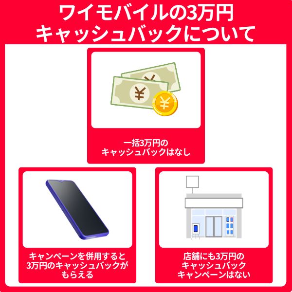現在、ワイモバイルでは単体で30,000円のキャッシュバックを実施していません。