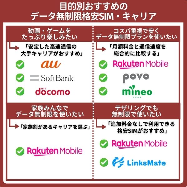 一方、動画視聴やテザリングなどで常に多くのデータを使う方には、無制限プランが安心です。