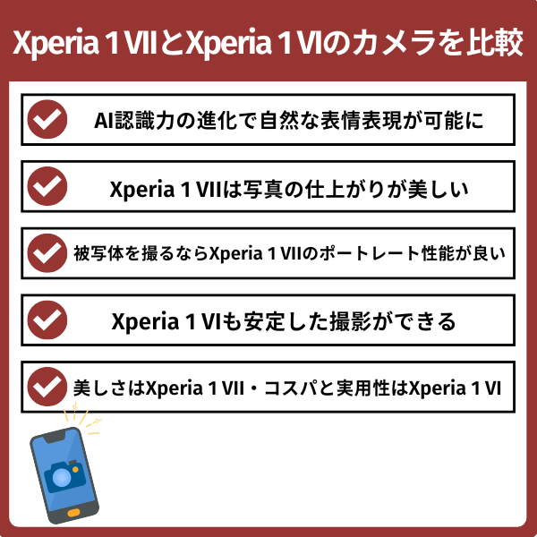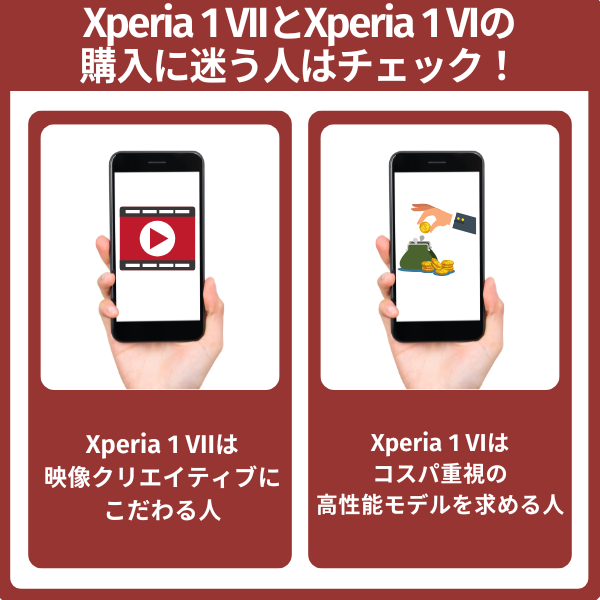 コストパフォーマンスを重視する人はXperia 1 VI、最新のAI機能やカメラ性能を求める人は、Xperia 1 VIIがおすすめです。