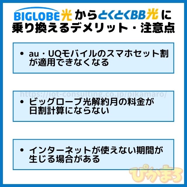 ビッグローブ光からとくとくBB光への乗り換えは多くのメリットがありますが、下記のデメリットや注意点も存在します。