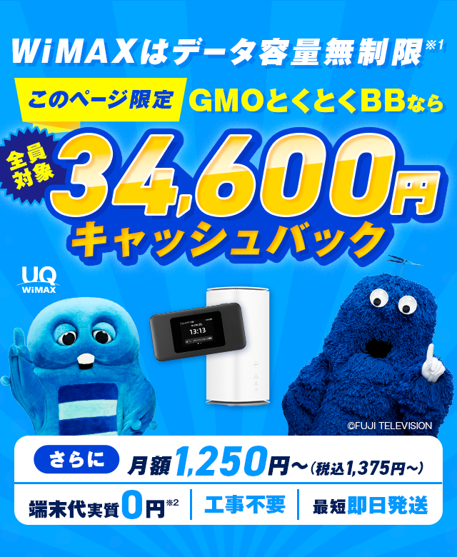 一方、GMOとくとくBB WiMAXは月額4,807円と高めですが、最大104,320円のキャッシュバックで2年間の実質月額は約510円まで下がります。