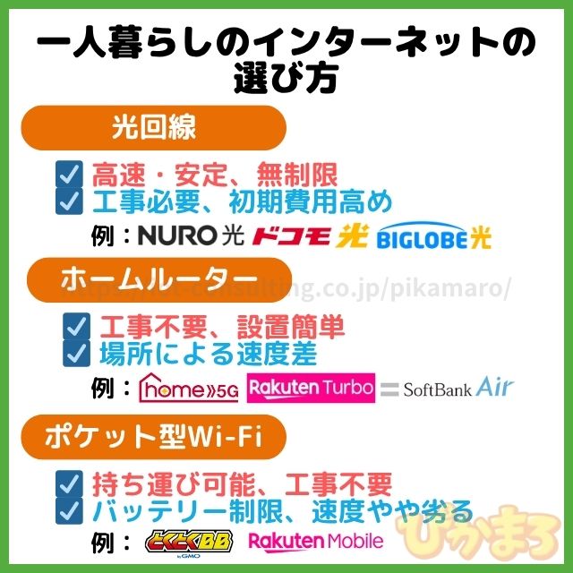 光回線は速度重視、ホームルーターは手軽さ重視、ポケット型は持ち運び重視と考えると選びやすくなります。賃貸物件では工事の可否も重要な判断基準になります。